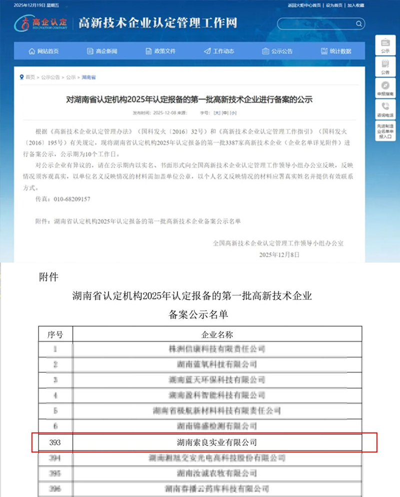 近日,经全国高新技术企业认定管理工作领导小组办公室审定,湖南省2025年第一批高新技术企业备案名单正式公示。湖南索良实业有限公司凭借扎实的技术创新能力、完善的研发体系和突出的市场转化成效,成功通过国家严格评审,荣获“国家高新技术企业”资质认定。这一国家级荣誉的获得,标志着企业在技术创新能力、综合发展质量等方面获得权威认可,正式跻身国家高新技术企业行列。