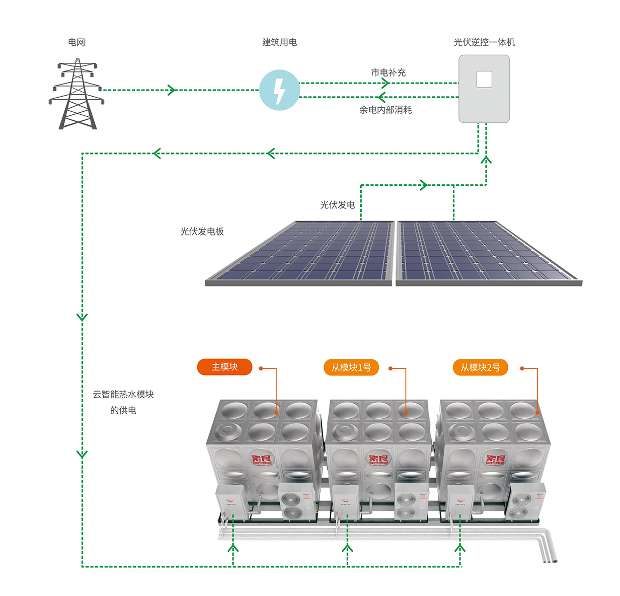 将太阳能光伏系统与云智能热水模块相结合,可以实现能源的综合利用。太阳能光伏系统可以为云智能热水模块提供电力,使其在晴天时更加高效。多余的光伏电力还可以用于用电需求,包括照明、电器或余电,上网。这种解决方案有助于减少商业建筑的能源消耗,降低能源账单、减轻对化石燃料的依赖,同时降低碳排放,更有益于环保。