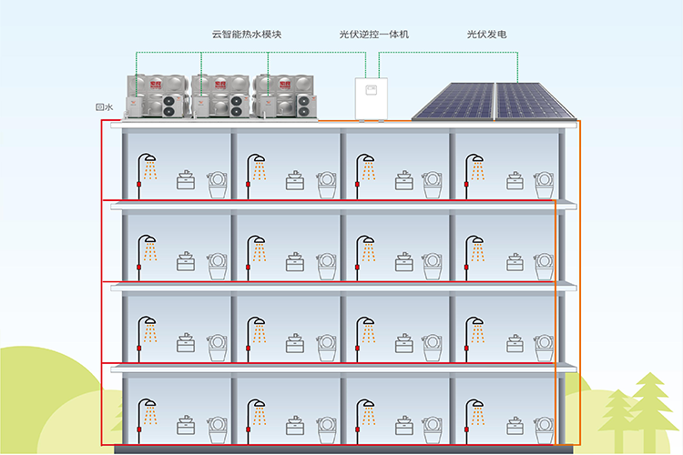 将太阳能光伏系统与云智能热水模块相结合,可以实现能源的综合利用。太阳能光伏系统可以为云智能热水模块提供电力,使其在晴天时更加高效。多余的光伏电力还可以用于用电需求,包括照明、电器或余电,上网。这种解决方案有助于减少商业建筑的能源消耗,降低能源账单、减轻对化石燃料的依赖,同时降低碳排放,更有益于环保。