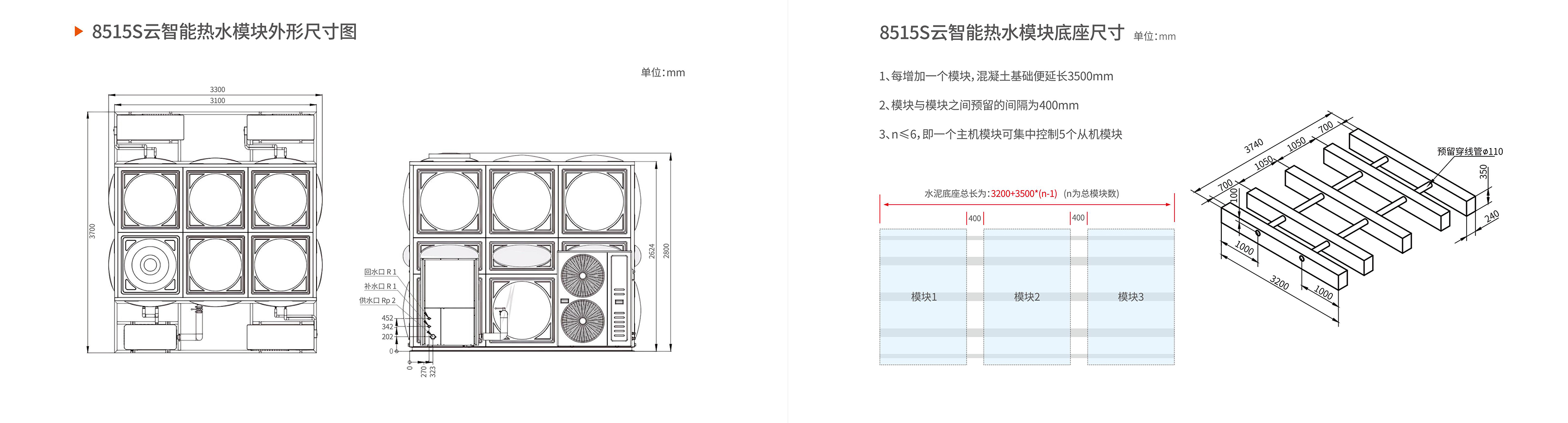 热水模块是一套将超低温热泵主机、水箱、云智能热水机房、及配套设备,安装固定在钢结构上的大型模块化热水装置,实现热水系统的安装模块化、扩展模块化、控制模块化等。
