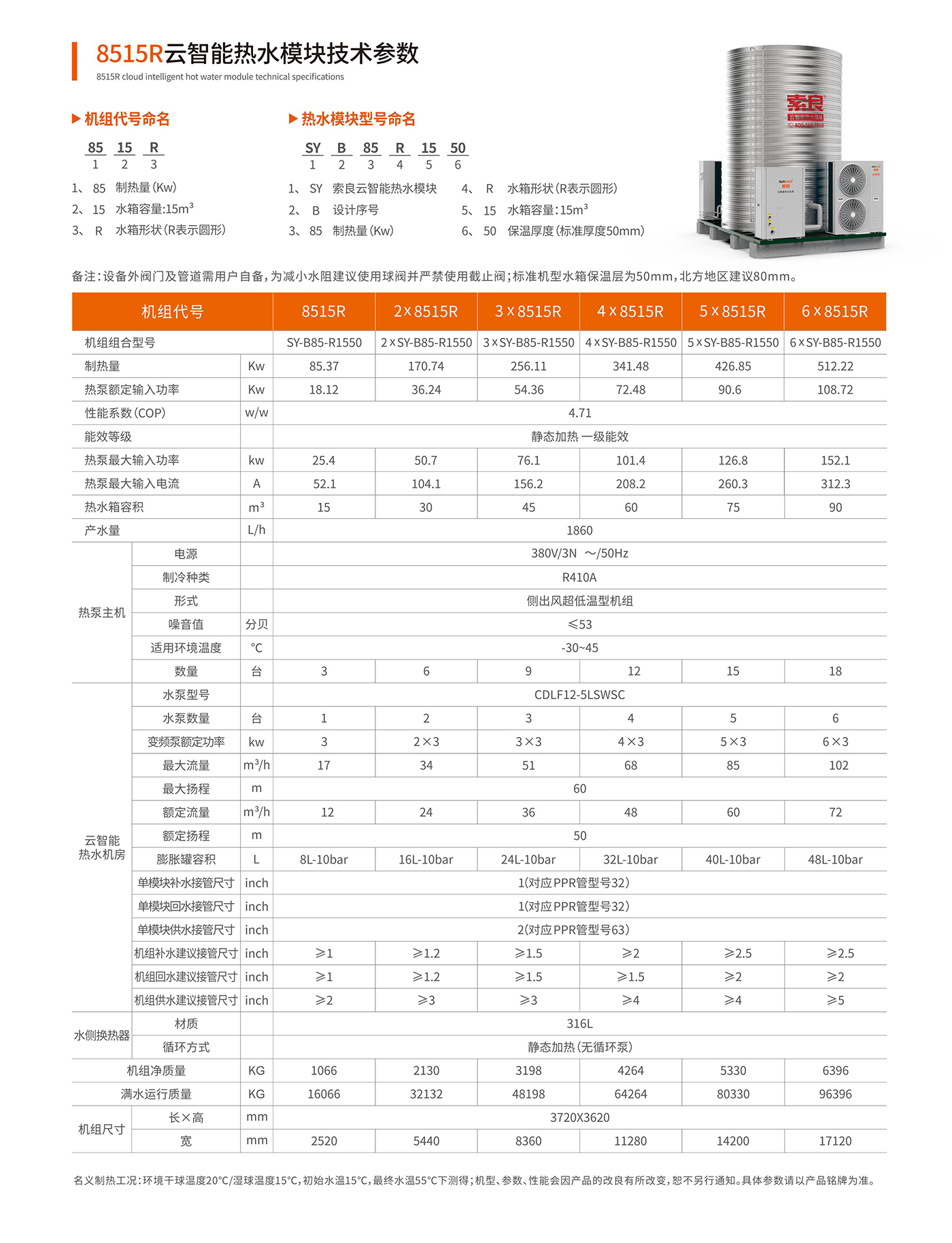 索良云智能热水模块是一套将超低温热泵主机、水箱、云智能热水机房、及配套设备,安装固定在钢结构上的大型模块化热水装置,实现热水系统的安装模块化、扩展模块化、控制模块化等。