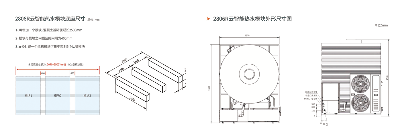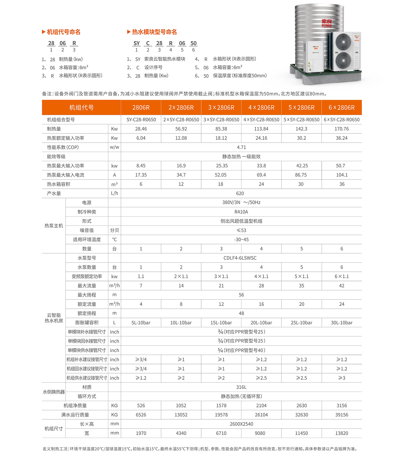 索良云智能热水模块是一套将超低温热泵主机、水箱、云智能热水机房、及配套设备,安装固定在钢结构上的大型模块化热水装置,9实现热水系统的安装模块化、扩展模块化、控制模块化等。